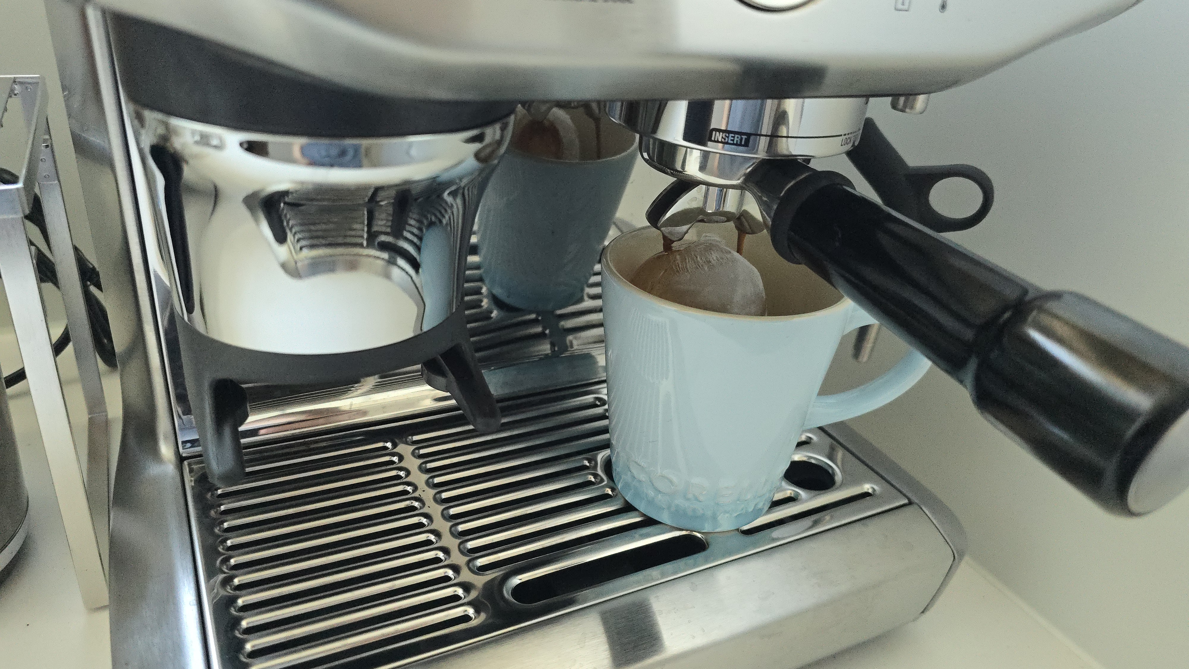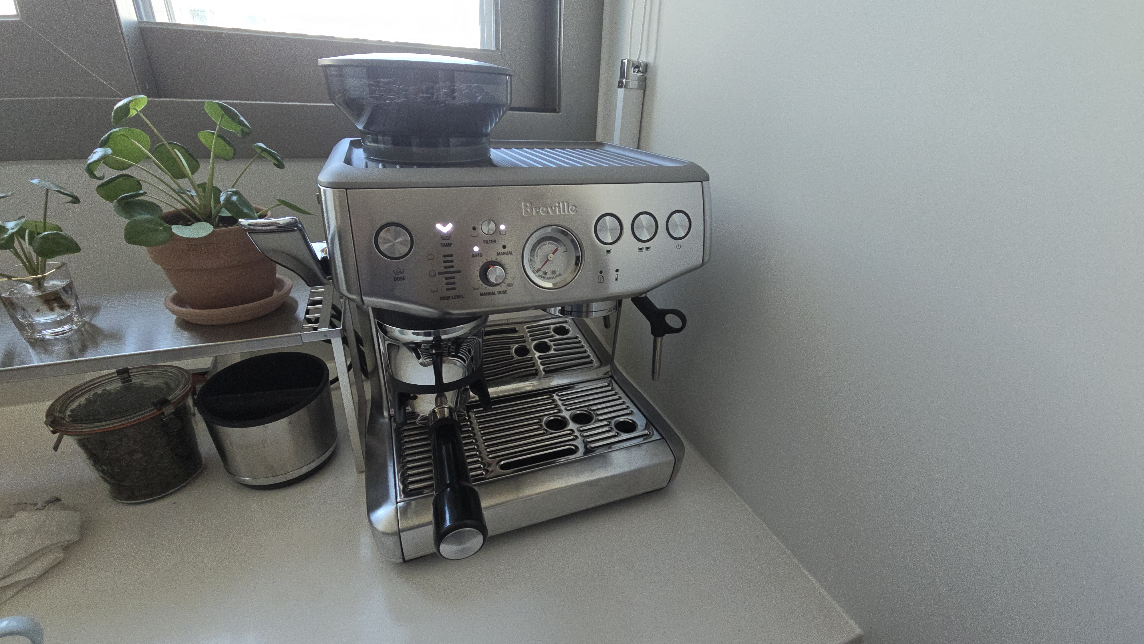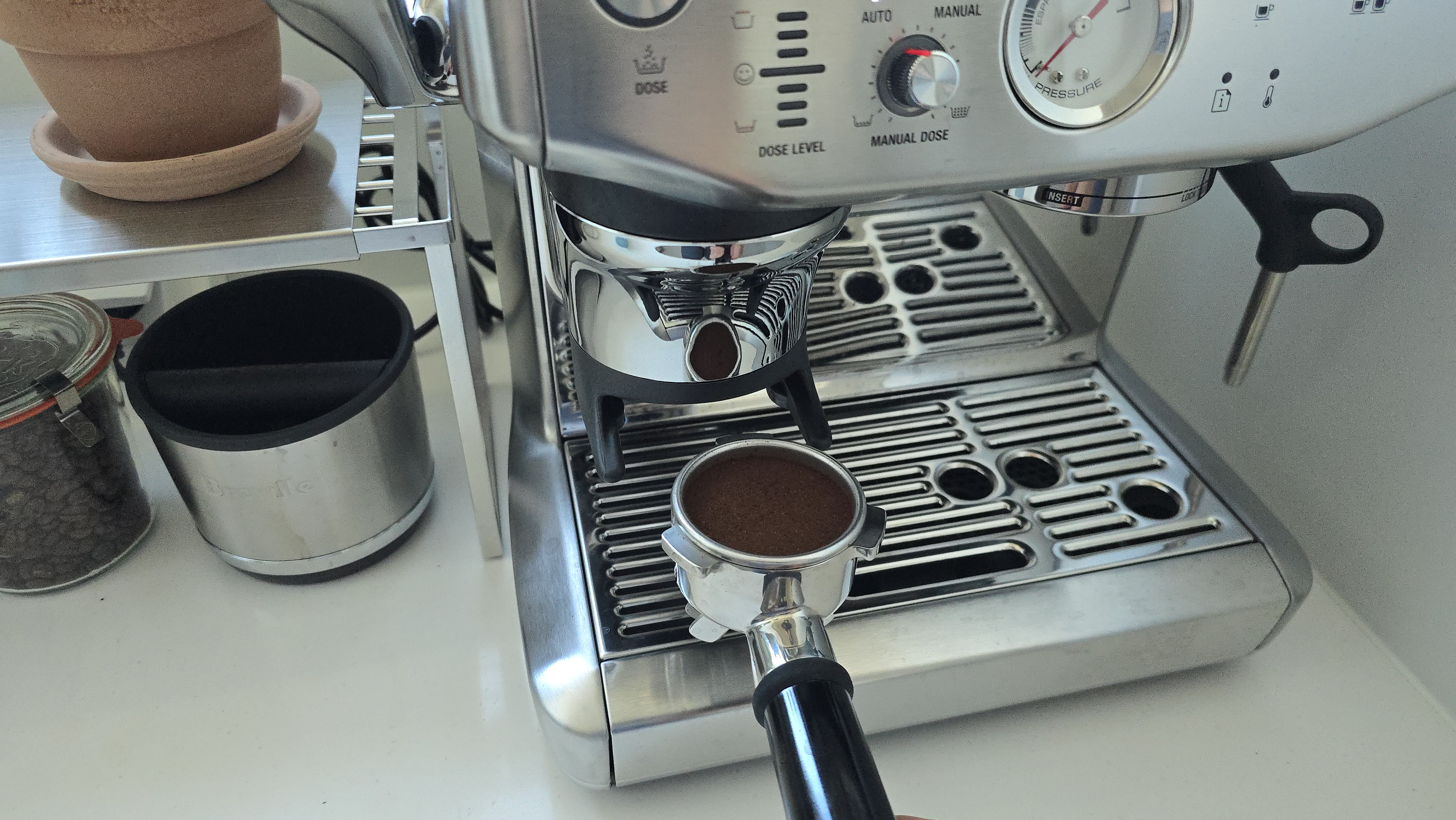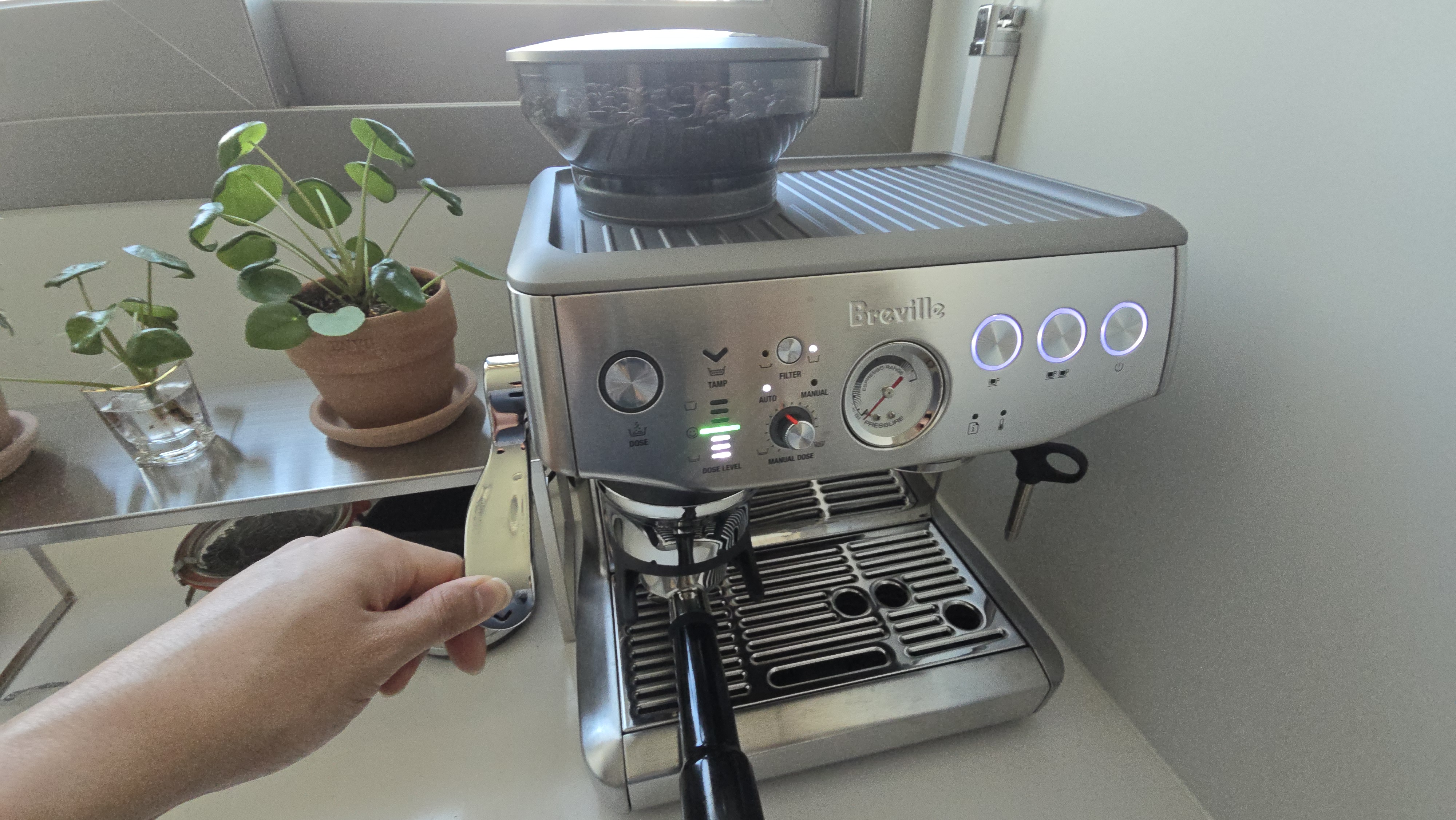 원두를 자동으로 갈고 dose 버튼 후 자동 탬핑!! 손으로 내리면 초록불이 뜬다